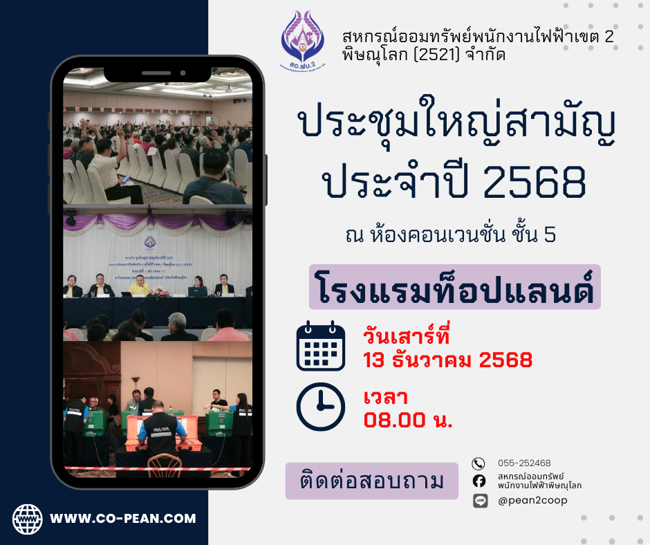 ประชุมใหญ่สามัญประจำปี 2568 ในวันเสาร์ที่ 13 ธันวาคม 2568 ณ ห้องคอนเวนชั่น โรงแรมท็อปแลนด์ จังหวัดพิษณุโลก